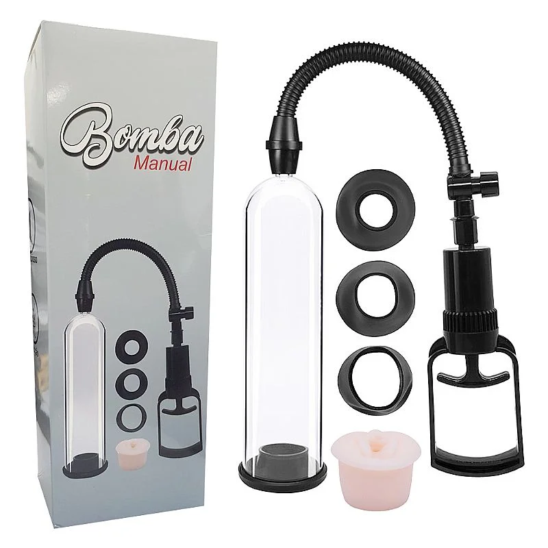 💡 Possui medidor de pressão, gatilho manual de fácil uso e 3 anéis de silicone (sendo um com formato anatômico que simula uma vagina).