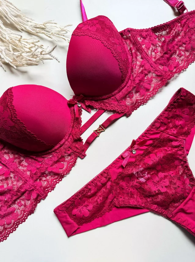 Sinta-se poderosa e confortável com este conjunto de lingerie com bojo, confeccionado em renda delicada e microfibra de poliamida, que se ajusta perfeitamente ao corpo e valoriza suas curvas 💖.
